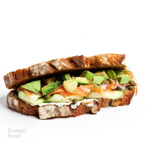 40 گرم سلمن نروزی دودی، کرم شوید، آواکادو، کیپرز، خیار، زست لیمو
