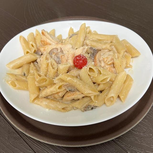 300 گرم پاستا پنه، 120 گرم فیله مرغ، قارچ، پنیر پارمسان، سس آلفردو