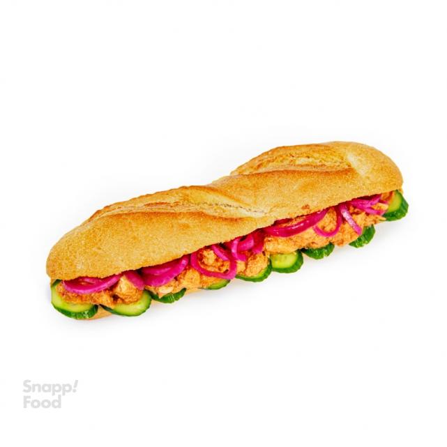 نان فرنچ، سس باتر چیکن، خیار اسلایس شده، سینه مرغ مخلوط با سس باتر چیکن، پیکل پیاز قرمز
