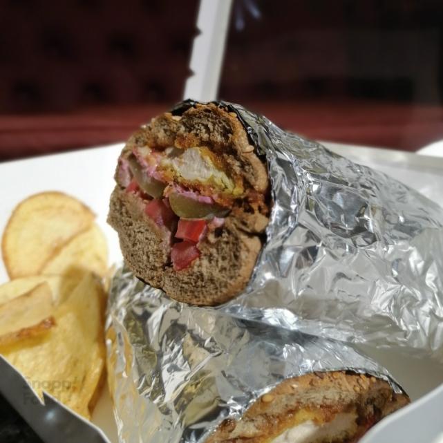 فیله مرغ سوخاری، سالاد کلم، خیارشور، گوجه، سس چیلی تای، نان نیم باگت