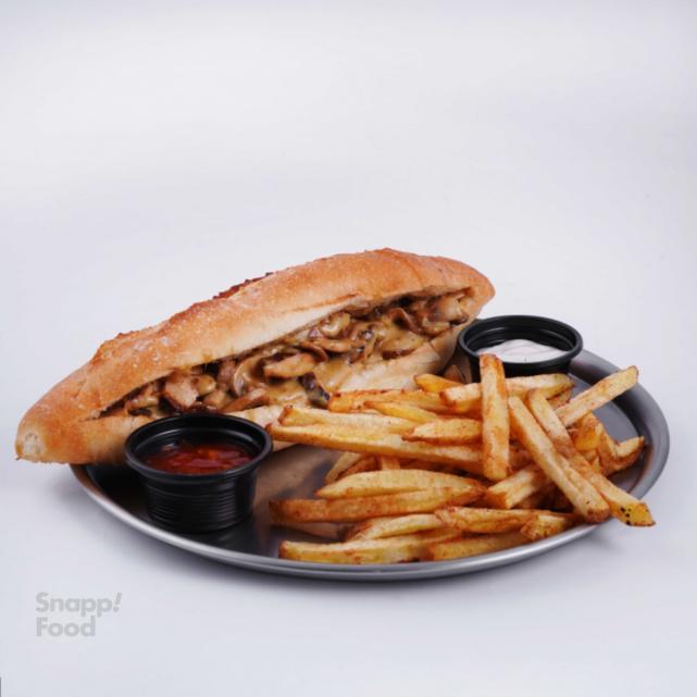 نان نیم باگت، ۱۲۰ گرم راسته گوساله، قارچ، پنیر موتزارلا، سیب زمینی سرخ شده، سس