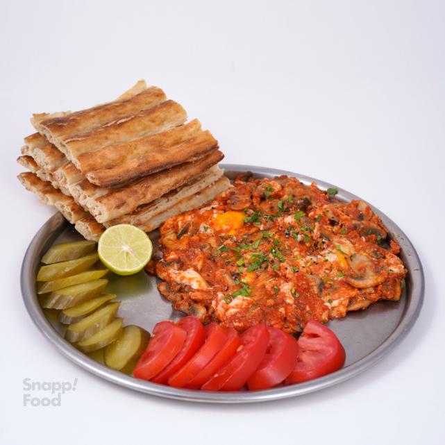۲ عدد تخم مرغ، قارچ، گوجه، ۴ تکه نان بربری