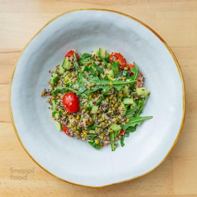 100گرم دانه کینوا.70گرم ماش .فلفل دلمه.خیار. روکولا.سس لیمو