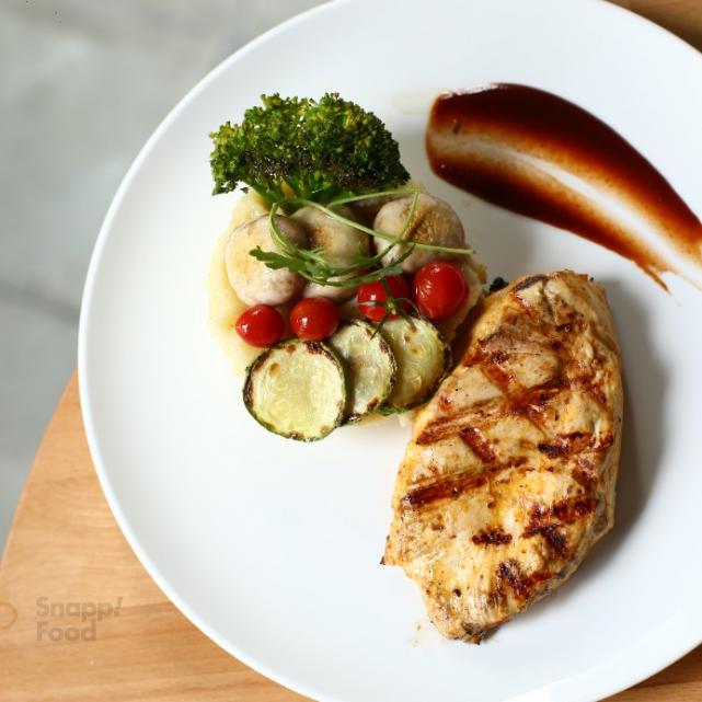 220 گرم گرم سینه مرغ گریل، گوجه، کلم بروکلی، گوجه کیلاسی، ذرت، پوره سیب زمینی