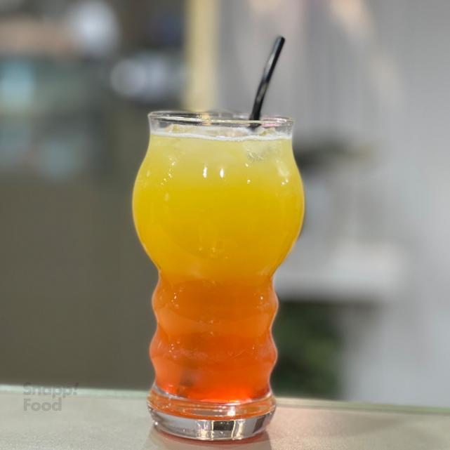 یک لیوان ۴۰۰ میل از ترکیب آب آناناس، آب پرتغال و لیمو. یخ خورد شده با طعم ملس