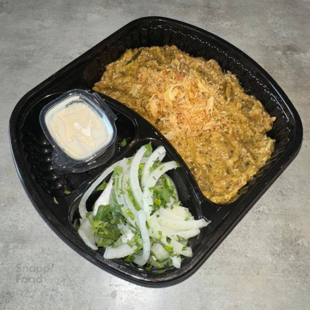 3 عدد تخم مرغ، رب، پیاز داغ، دورچین: خیارشور، کلم قرمز، اسلایس لیمو، نان سنتی