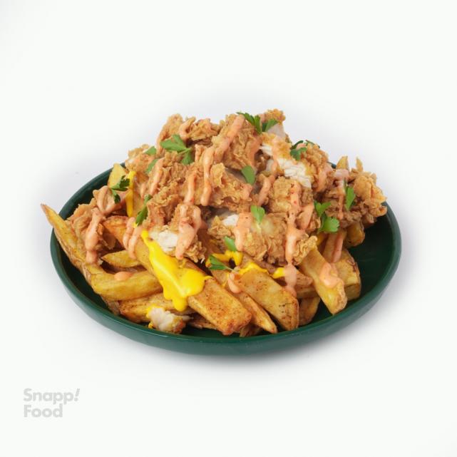 ۲۰۰ گرم فیله استریپس ،۴۰۰ گرم سیب زمینی سرخ شده،دیپ گودا،سس قارچ،جعفری