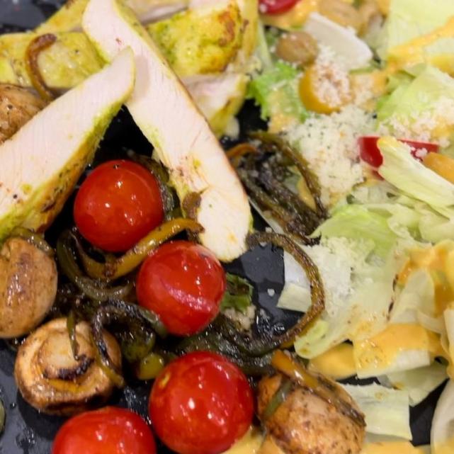 سینه مرغ گریل ۲۲۰ گرم، قارچ، گوجه گیلاسی، فلفل دلمه ای بلانچ شده، کاهو، زیتون اسلایس، سس رژیمی سبزیجات(کدو.هویج)