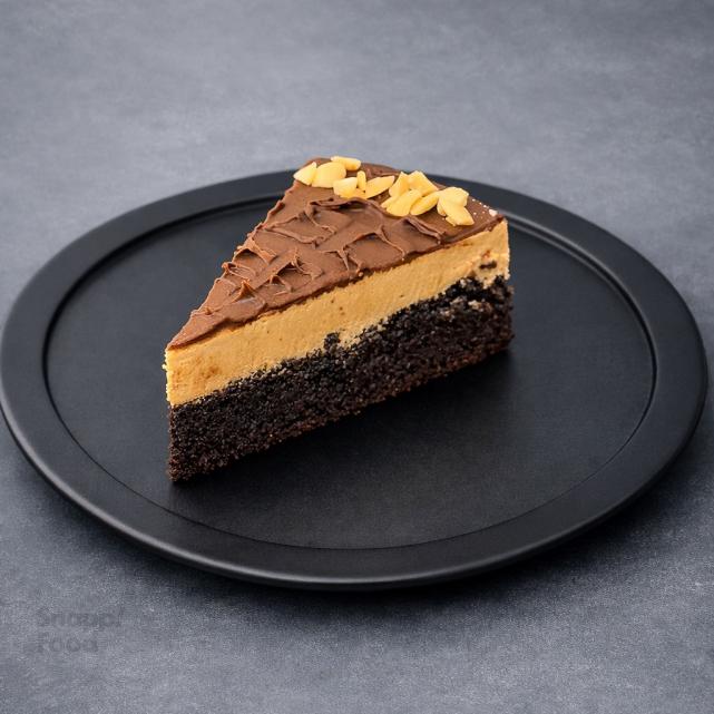 یک اسلایس ، وزن ۱۳۰ گرم ، کف بیسکویت ، پنیر خامه ای ، کارامل ، بادام زمینی
