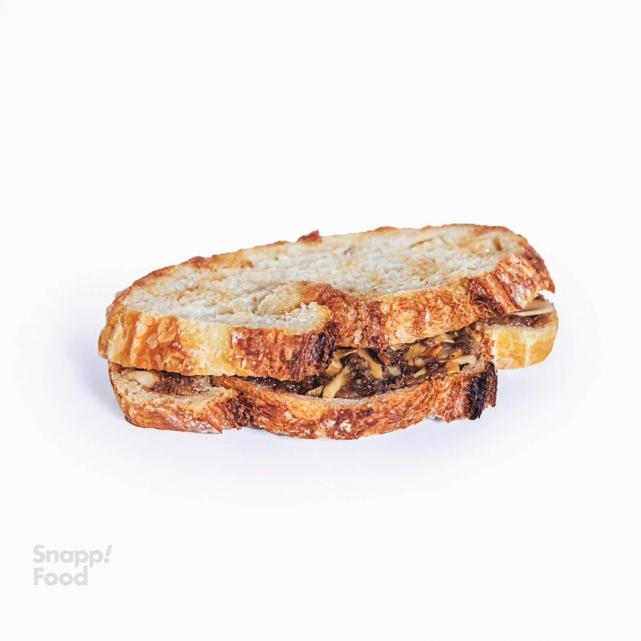 نان چاپاتا آرتیسان، پنیر لبنه، تخم مرغ اسکرامبل شده همراه با اسفناج و قارچ