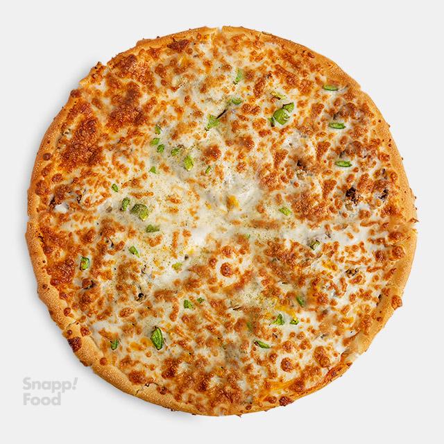 ژامبون مرغ، کالباسگوشت، سس مخصوص، قارچ، پنیر ترکیبی، فلفل دلمه، خمیر مخصوص