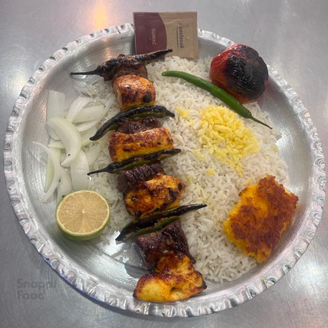 2 سیخ کباب کوبیده 240 گرم، تکه های مرغ، 450 گرم برنج ا، گوجه، ترشی، پیاز و جعفری، کره