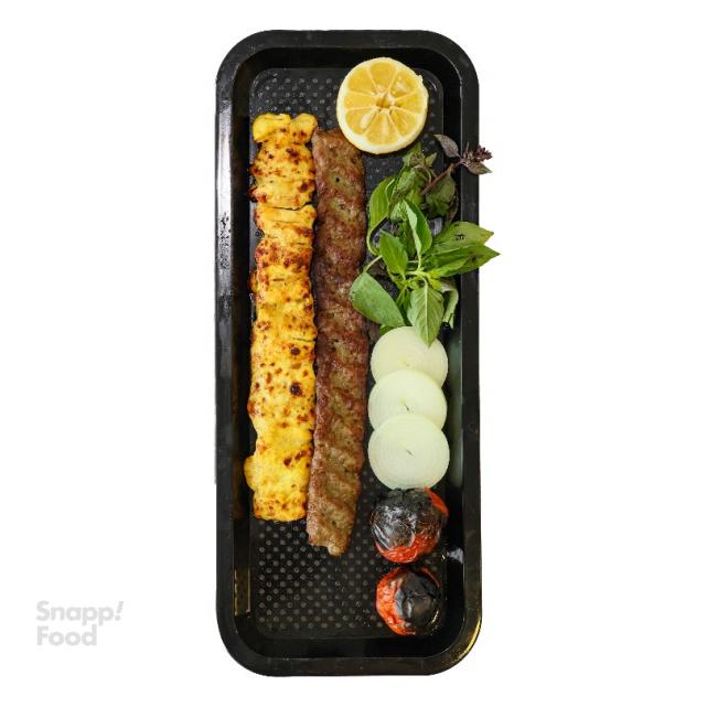 یک سیخ کباب کوبیده گوشت مخلوط گوساله و گوسفندی 120 گرمی، یک سیخ جوجه کباب بدون استخوان ران و سینه مرغ 220 گرمی به انتخاب شما، دورچین: سبزی خوردن، لیمو ترش تازه یا نارنج، گوجه کبابی، همراه با یک عدد نان لواش