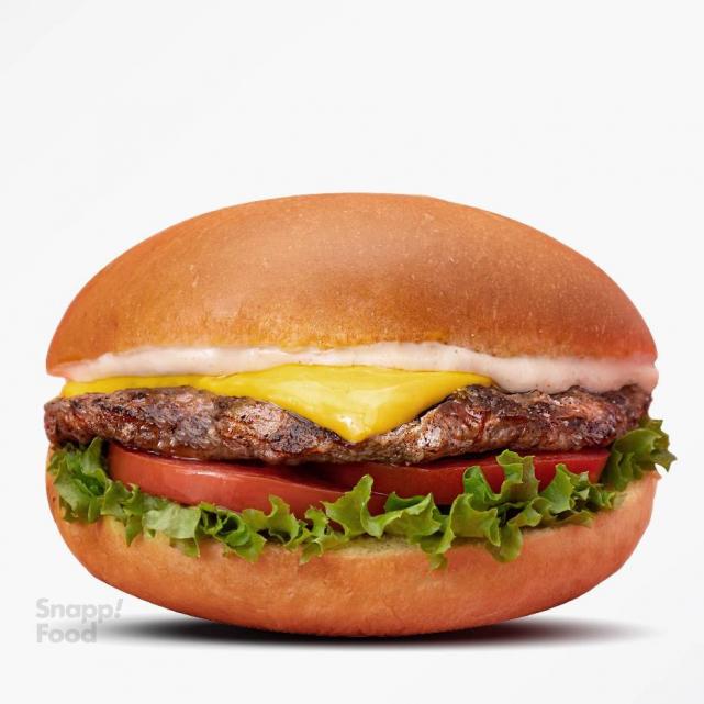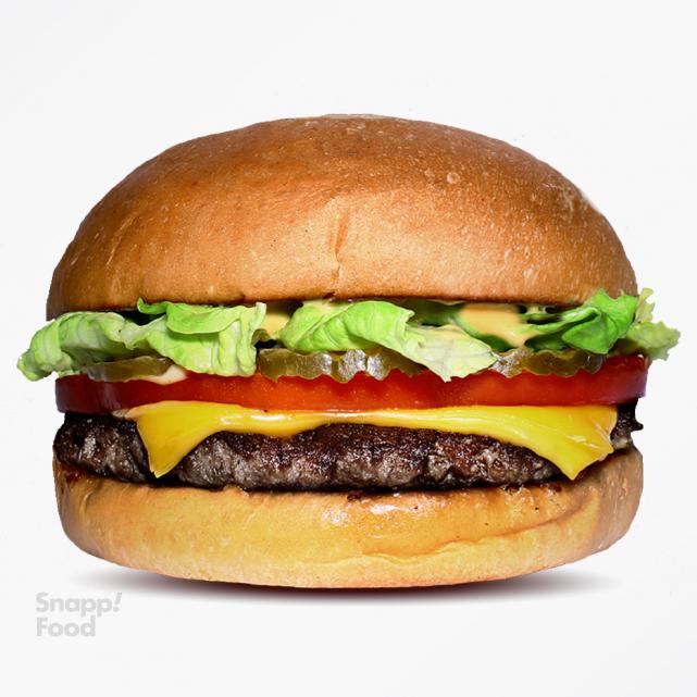 یک عدد برگر دست ساز گوشت گوساله 115 گرمی، پنیر زرد آمریکایی، سس مخصوص، خیارشور، کاهو، گوجه، نان برگر تست شده