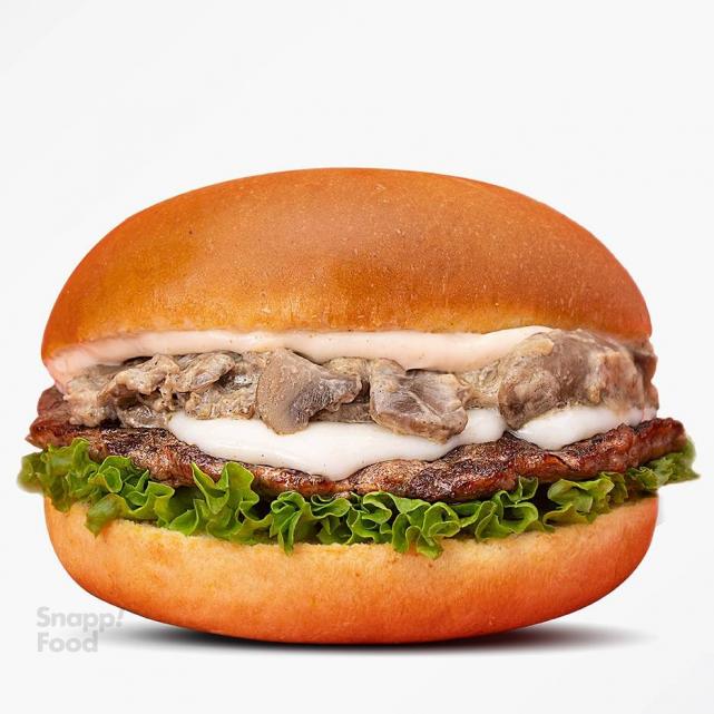 یک عدد برگر دست ساز گوشت گوساله 115 گرمی، پنیر زرد آمریکایی، پنیر امنتال، سس مخصوص، سس قارچ، خیارشور، نان برگر تست شده