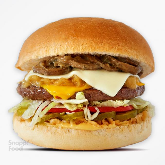 2 عدد برگر دست ساز گوشت گوساله 115 گرمی، 2 عدد پنیر زرد آمریکایی، 2 عدد پنیر امنتال، سس مخصوص، پیاز کاراملی، سس قارچ، خیارشور، کاهو، گوجه، نان برگر تست شده