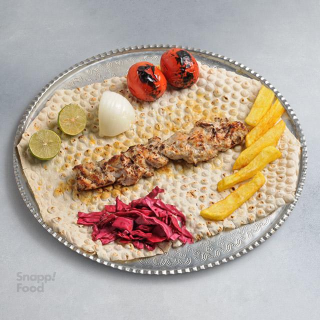 یک سیخ جوجه زعفرانی سینه مرغ 180 گرمی، دورچین: گوجه کبابی، ترشی کلم قرمز، لیموترش، پیاز، یک عدد نان لواش