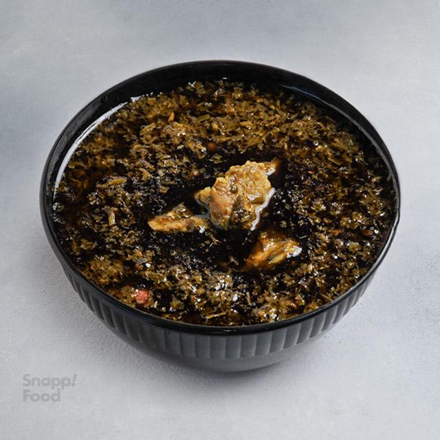 350 گرم خورشت قورمه سبزی، 50 گرم گوشت گوساله، دو تکه گوشت کوچک سبزیجات معطر سرخ شده، 450 گرم برنج