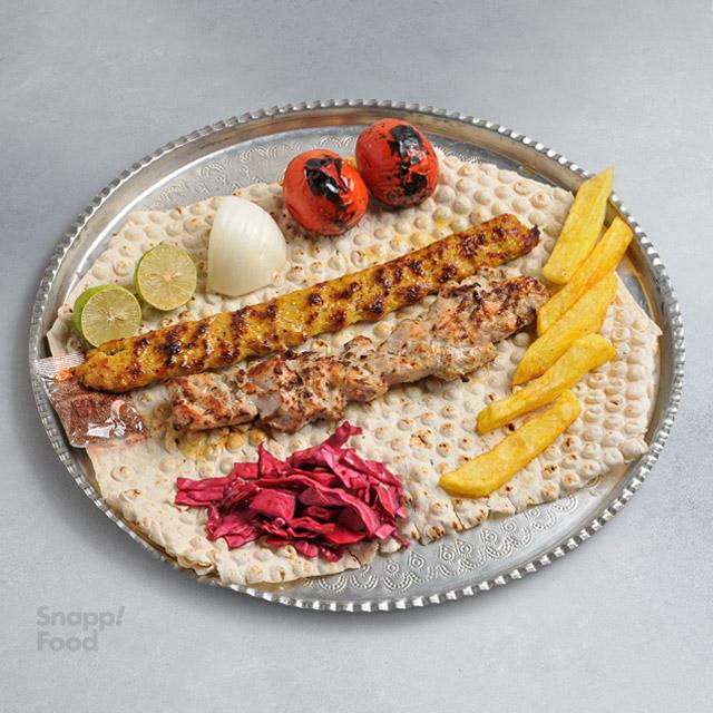 یک سیخ جوجه زعفرانی سینه مرغ 180 گرمی، یک سیخ کوبیده مخلوط گوشت گوساله و گوسفندی 100 گرمی، دورچین به فصل: گوجه کبابی، ترشی کلم قرمز یا هویج، لیموترش، پیاز، یک عدد نان لواش