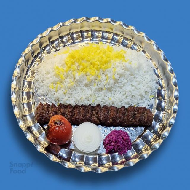 کباب کوبیده مخلوط گوشت گوساله و گوسفندی ۱۲۰ گرمی، 350 گرم برنج پخته شده، دورچین: گوجه، سماق