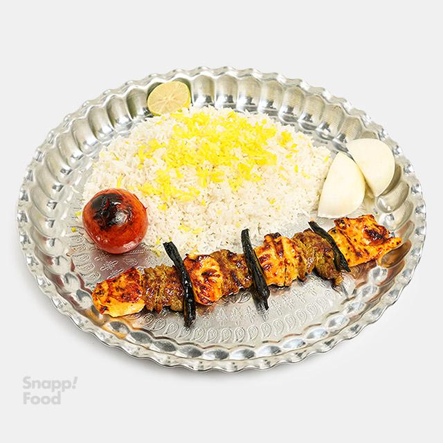 یک سیخ کباب کوبیده گوشت مخلوط گوساله و گوسفندی 90 گرمی، یک سیخ جوجه کباب مرغ بدون استخوان زعفرانی 200 گرمی، 450 گرم برنج مخلوط ایرانی و خارجی، دورچین: گوجه کبابی، پیاز، لیمو ترش، سالاد کلم