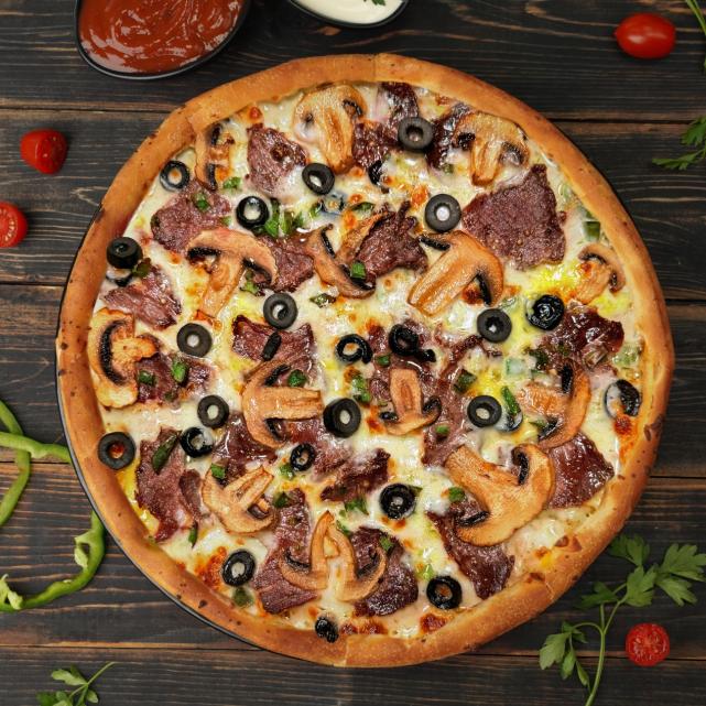 خمیر پیتزا کلاسیک ۲۴ سانتی ، سس پایه، پنیر موزارلا ، بیف اسموکی، ژامبون مرغ۹۰ درصد، قارچ، فلفل دلمه