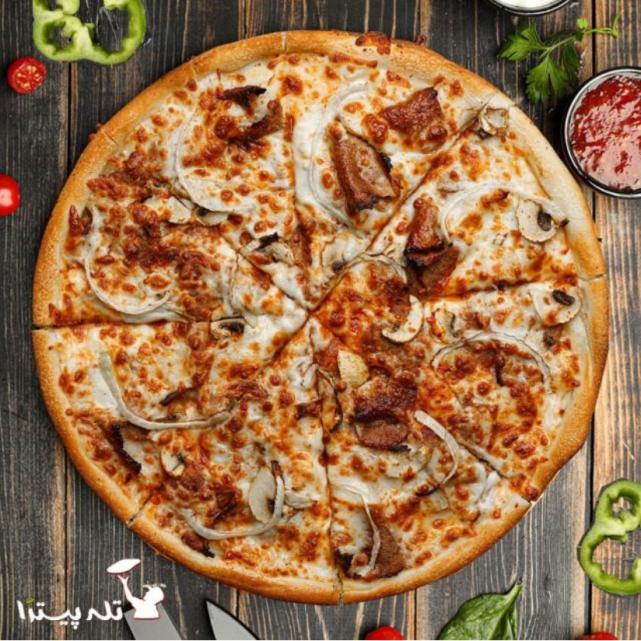 خمیر پیتزا کلاسیک 24 سانتی، سس خامه، پنیر موزارلا ، گوشت ریش گوساله،پیاز،قارچ،چیپس خلالی