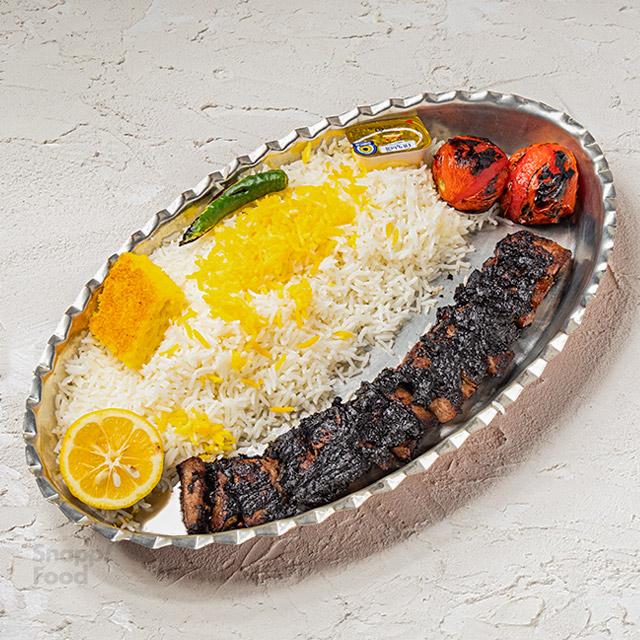یک سیخ کباب برگ گوشت گوسفندی 200 گرمی، 350 گرم برنج ایرانی، دورچین: گوجه کبابی ۲ تکه ، فلفل کبابی ، نثار زعفرونی ، لیمو ترش تازه، ته چین و کره