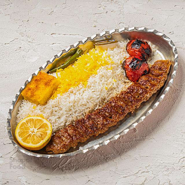 کباب کوبیده گوشت مخلوط گوساله و گوسفندی 120 گرمی، 350 گرم برنج ایرانی، دورچین: گوجه فرنگی کبابی ۲ تکه ،فلفل کبابی ،نثار زعفرانی ، لیمو ترش تازه، ته چین ، کره