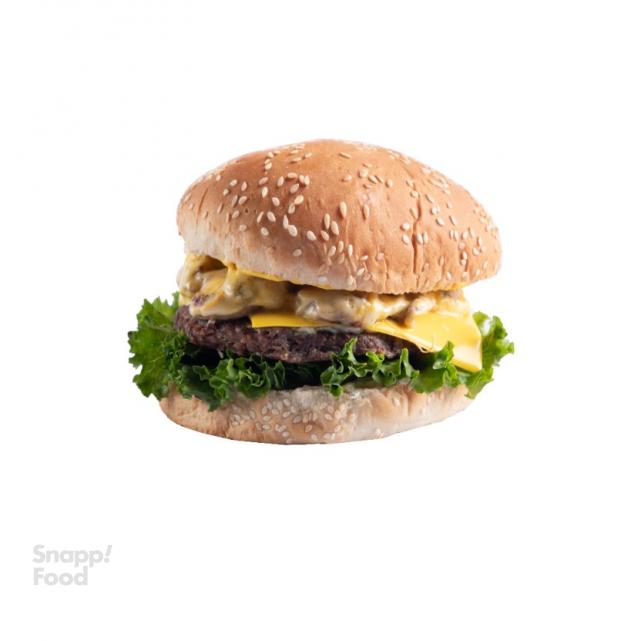 یک عدد برگر دست ساز گوساله ۱۴۰ گرمی، گوجه، خیار شور، سس مخصوص، نان گرد فرانسوی