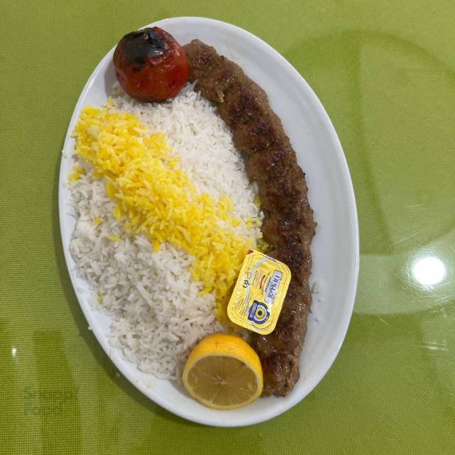یک سیخ کباب کوبیده مخلوط گوشت گوساله و گوسفندی 150 گرمی، 450 گرم مخلوط برنج ایرانی و خارجی، دورچین: گوجه کبابی، نارنج، کره یک نفره، نصف نان لواش