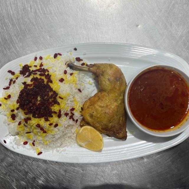 یک عدد ران مرغ سرخ شده، زرشک، 450 گرم مخلوط برنج ایرانی و خارجی