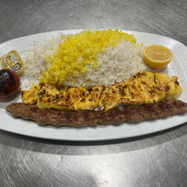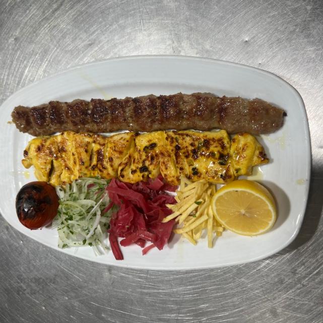 یک سیخ کباب کوبیده مخلوط گوشت گوساله و گوسفندی 150 گرمی، یک سیخ جوجه کباب سینه مرغ 200 گرمی، دورچین: بدون گوجه
