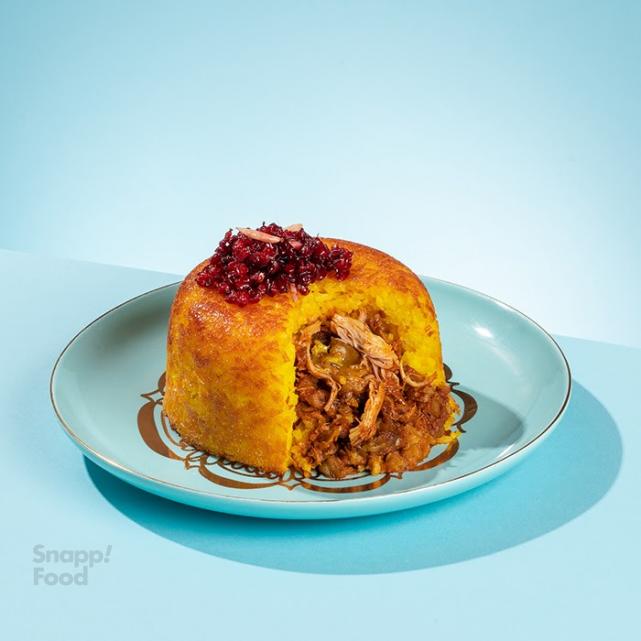 130 گرم سینه مرغ، زرشک، زعفران، 350 گرم ته چین قالبی بابرنج ایرانی