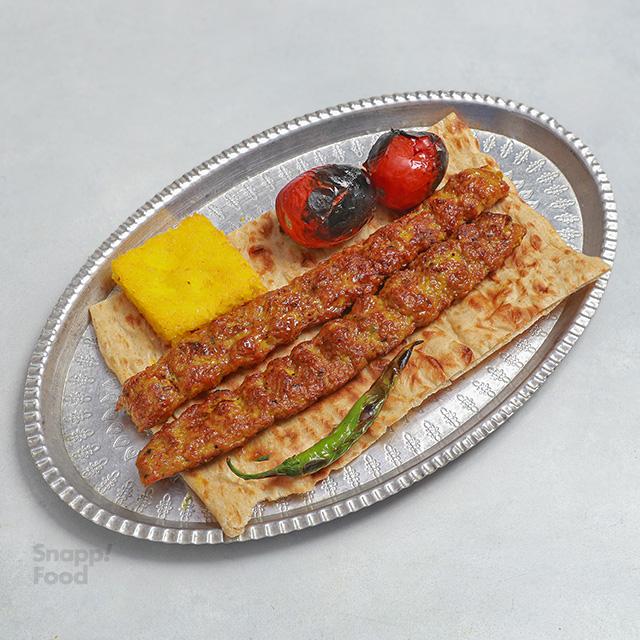2 سیخ کباب کوبیده مخلوط گوشت گوساله و گوسفندی 110 گرمی٬ 300 گرم برنج ایرانی٬ گوجه کبابی٬ فلفل کبابی٬ کره