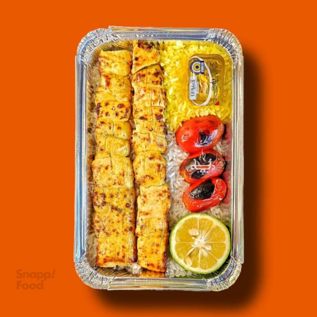 یک سیخ جوجه کباب زعفرانی سینه مرغ 200 گرمی، 350 گرم برنج ایرانی، کره، گوجه، نارنج