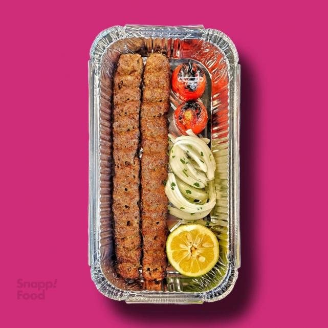 دو سیخ کباب کوبیده مخلوط گوساله و گوسفندی ۱۰۰ گرمی، ۲ تکه گوجه کبابی، نارنج، بدون نان