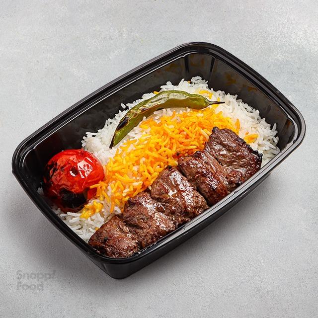 یک سیخ کباب مخلوط گوساله و گوسفندی ۳۰۰ گرمی، ۳۵۰ گرم برنج ایرانی زعفرانی، دورچین: گوجه کبابی، فلفل کبابی