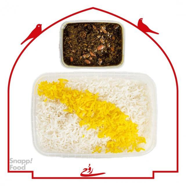 200 گرم خورشت قرمه سبزی با گوشت گوسفندی ، 350 گرم برنج ایرانی ، دورچین : پیاز
