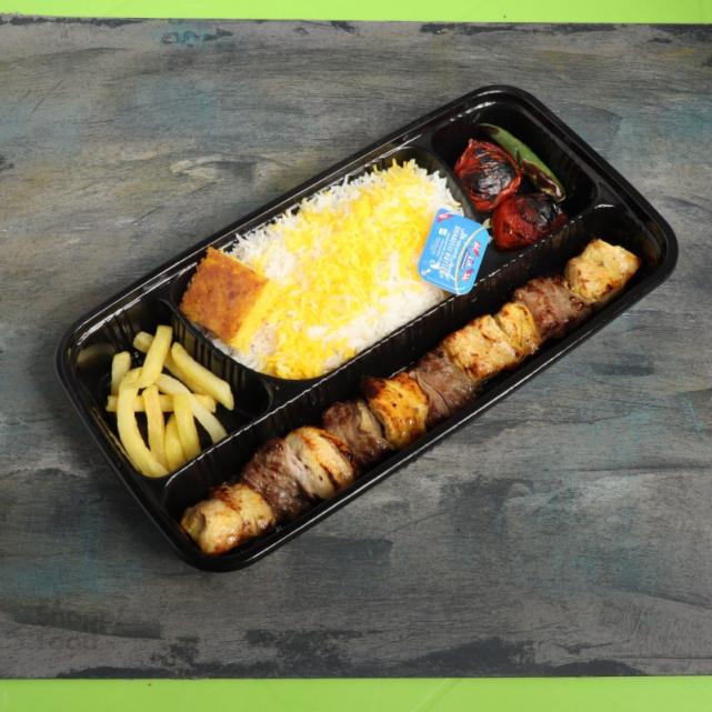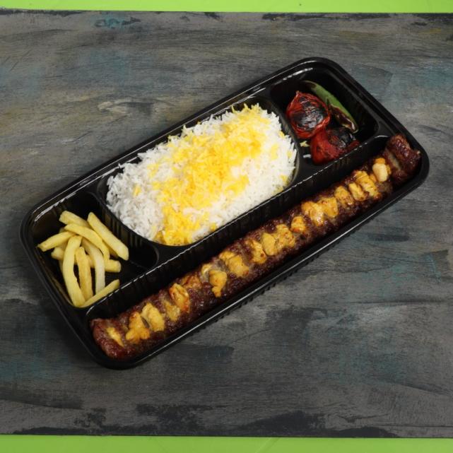 یک سیخ کباب کوبیده گوشت مخلوط گوساله گوسفندی 100 گرمی، یک سیخ جوجه کباب سینه مرغ 200 گرمی، 400 گرم برنج ایرانی، دورچین: نارنج یا لیمو، گوجه کبابی، سیب زمینی سرخ کرده