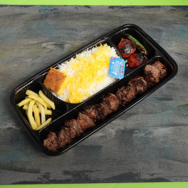 یک سیخ کباب لقمه گوشت مخلوط گوساله گوسفندی 250 گرمی، 400 گرم برنج ایرانی، دورچین: نارنج یا لیمو، گوجه کبابی، سیب زمینی سرخ کرده