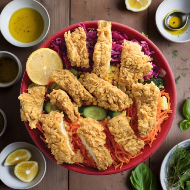 7 تکه فیله مرغ سوخاری، کاهو، هویج، خیار، کلم قرمز