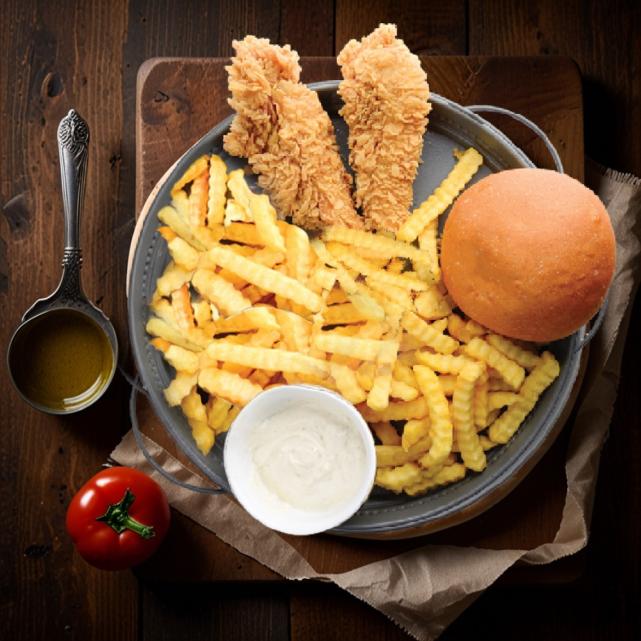 (بدون سالادکلم و نوشابه) ۲ تکه فیله مرغ استریپس، دورچین : سیب زمینی سرخ شده، سس مخصوص، نان بروتچن
