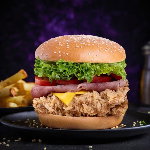 2 تکه فیله مرغ سوخاری 130 گرمی، یک عدد برگر دست ساز گوشت گوساله 80 گرمی، یک ورق پنیر گودا، سس، بدون نان