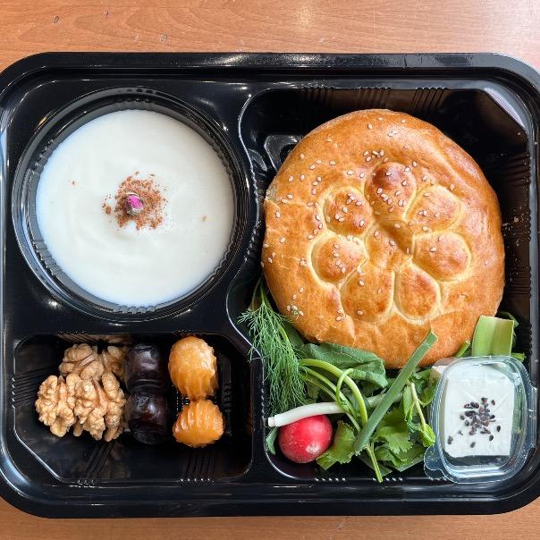 محتویات: فرنی، 2 عدد بامیه، نان سنتی، یک قالب پنیر، 5 عدد گردو، 2 عدد خرما، سبزی خوردن