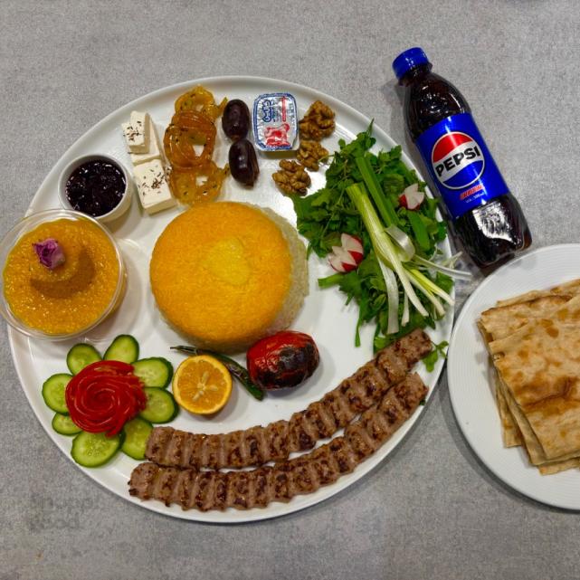 دو سیخ ۷۵ گرمی کوبیده ترکیب چرخ کرده مرغ و گوشت ، یک پرس برنج ایرانی بوزن ۳۵۰ گرم ، نارنج گوجه کبابی فلفل کبابی ، پک افطار شامل : پنیر۴۰ گرم، کره ۱۰ گرم ، شله زرد اعلا ، گردو ، خرما ۲ عدد ، زولبیا، مربا ، سبزی تازه ، خیار و گوجه ، ۲ بسته نان ، نوشابه