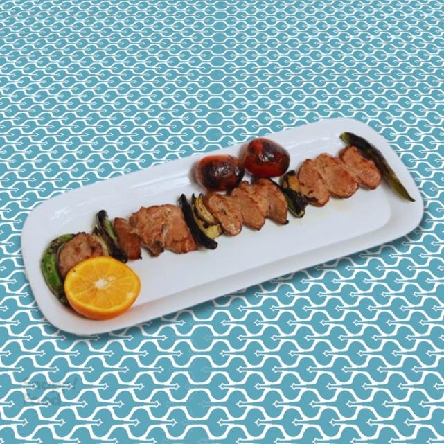 یک سیخ کباب لقمه مخلوط گوشت گوساله و گوسفندی 200 گرمی دورچین : گوجه کبابی، فلفل کبابی، پیاز کبابی، لیموترش یا نارنج، سماق و نان لواش ارائه در ظرف ماکروویو