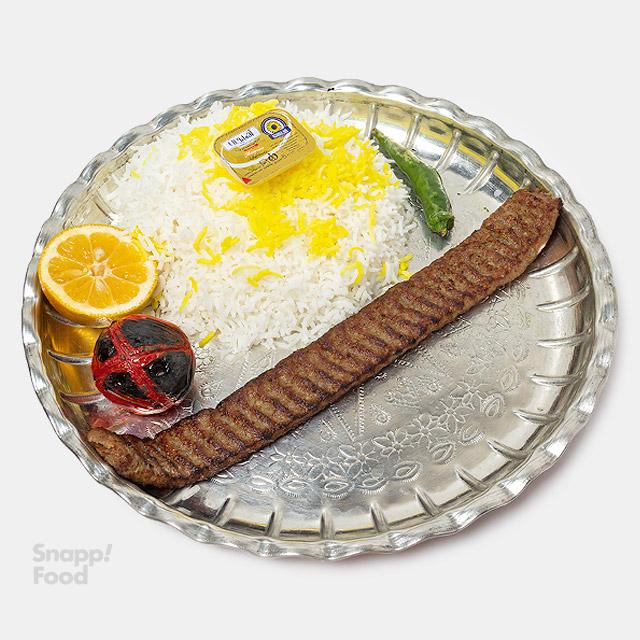 یک سیخ 140 گرمی کباب کوبیده مخلوط گوشت گوساله و گوسفندی، فلفل، گوجه، لیمو، 350 گرم برنج ایرانی