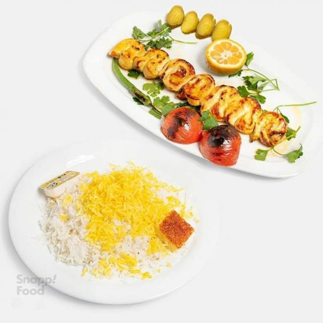 یک سیخ جوجه کباب 300 گرمی فیله مرغ، فلفل، گوجه، لیمو، 350 گرم برنج ایرانی