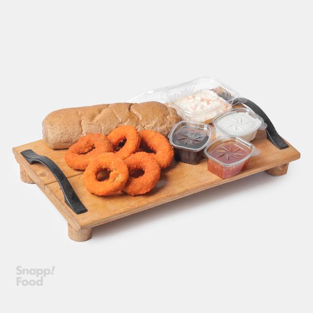 5 عدد پیاز، دو عدد سس مخصوص دست ساز، سالادکلم، نان لقمه ای